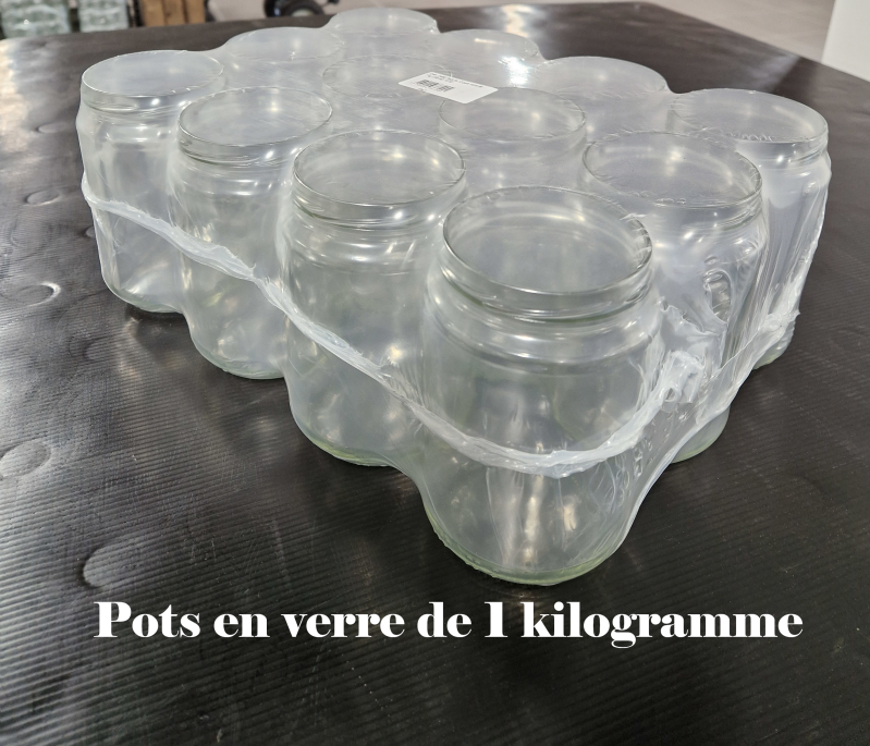- Pots en verre 1000gr/1 kg : pack de 12 pots à 6.60€ soit 0.55 cts le pot